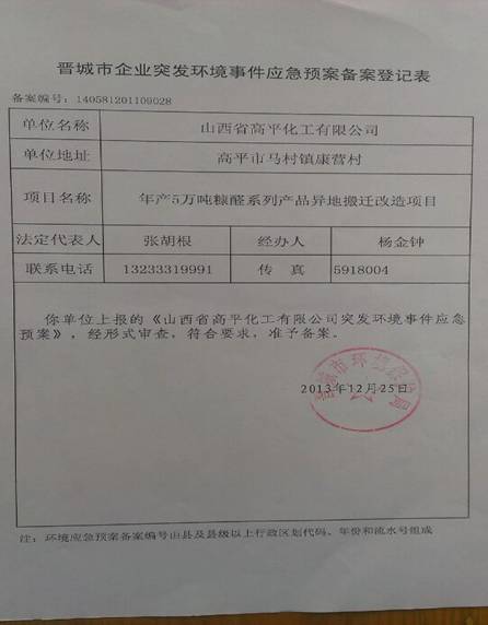 我公司制定的《山西省高平化工有限公司突發(fā)環(huán)境事件應(yīng)急預(yù)案》于2013年12月25日在晉城環(huán)保局備案。